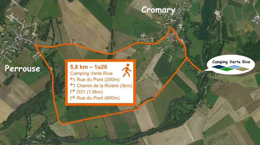 Wanderung 5,8 Km / 70 Min Cromary – Perrouse – Cromary (Der orange Wanderung in unserer Informationsbroschüre) Sie spazieren auf einem Feldweg bis zum Dorf Perrouse und kehren über die D31 zurück zum Dorf Cromary. - Die Route anschauen als jpg-Datei - Folgen Sie der Route über Komoot (Webseite) - Laden Sie die Route als GPX-Datei herunter, z.B. um über Ihre Navigations-App (z.B. Komoot-App) öffnen zu können |