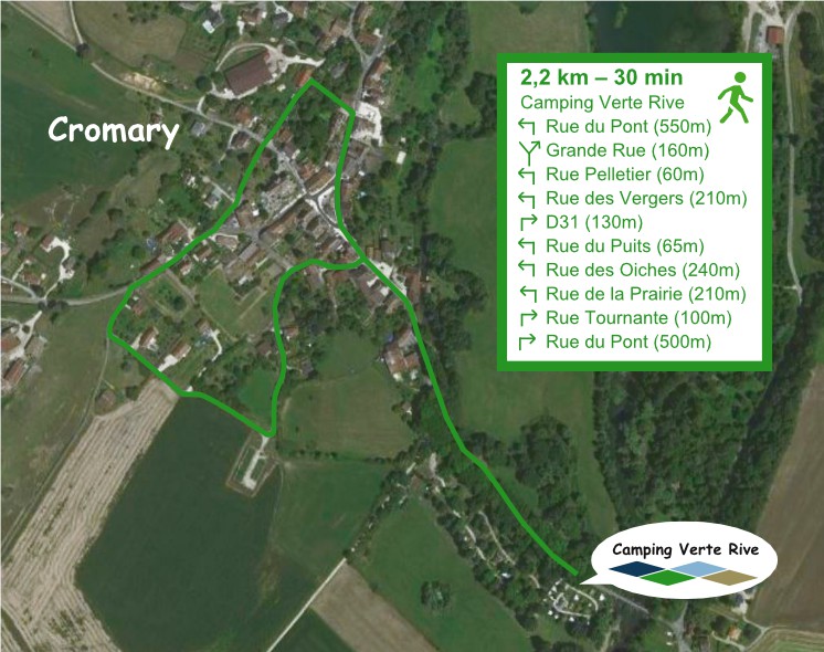 Wanderung 2,2 Km / 30 Min. Runde durch Cromary (Der grüne Wanderung in unserer Informationsbroschüre) Wandern Sie durch das Dorf Cromary und entdecken Sie mehrere bezaubernde Orte. - Die Route anschauen als jpg-Datei - Folgen Sie der Route über Komoot (Webseite) - Laden Sie die Route als GPX-Datei herunter, z.B. um über Ihre Navigations-App (z.B. Komoot-App) öffnen zu können |